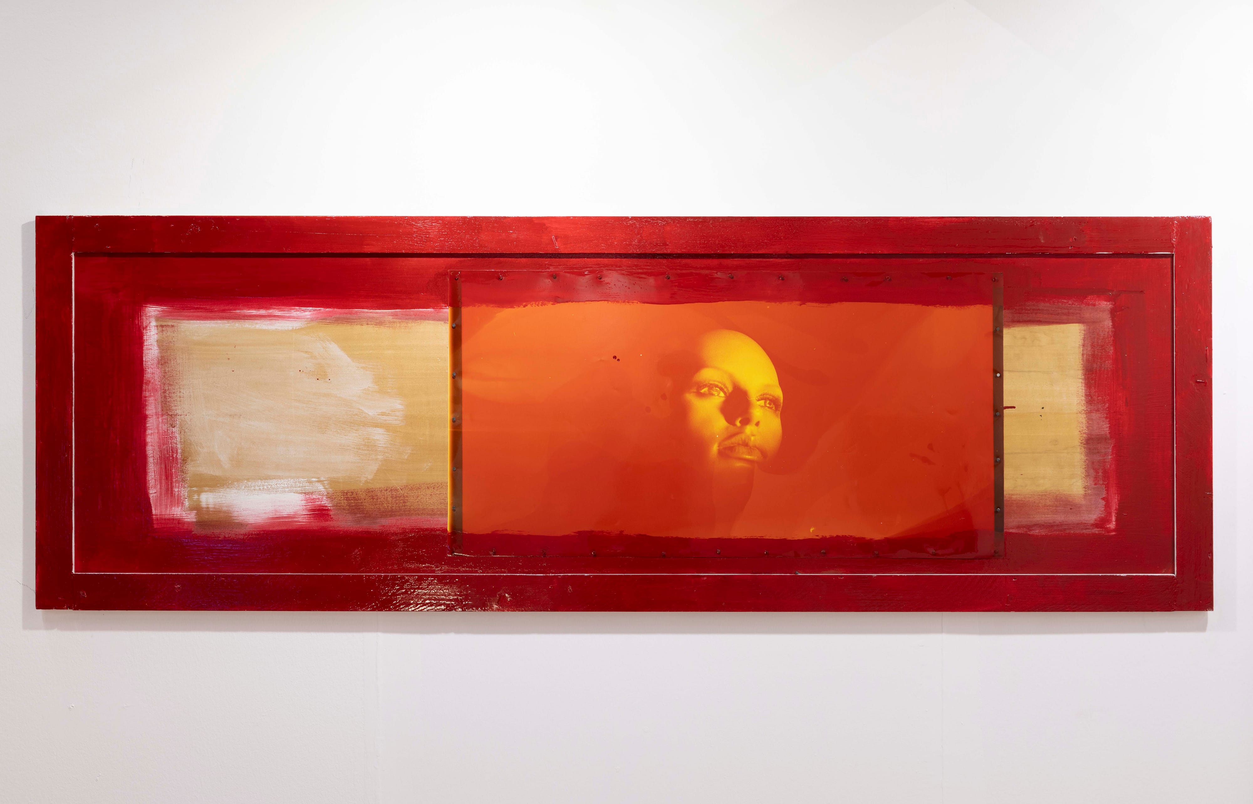 hand-printed color photographs on glossy paper, hair, oil, feather, foundation, wood
